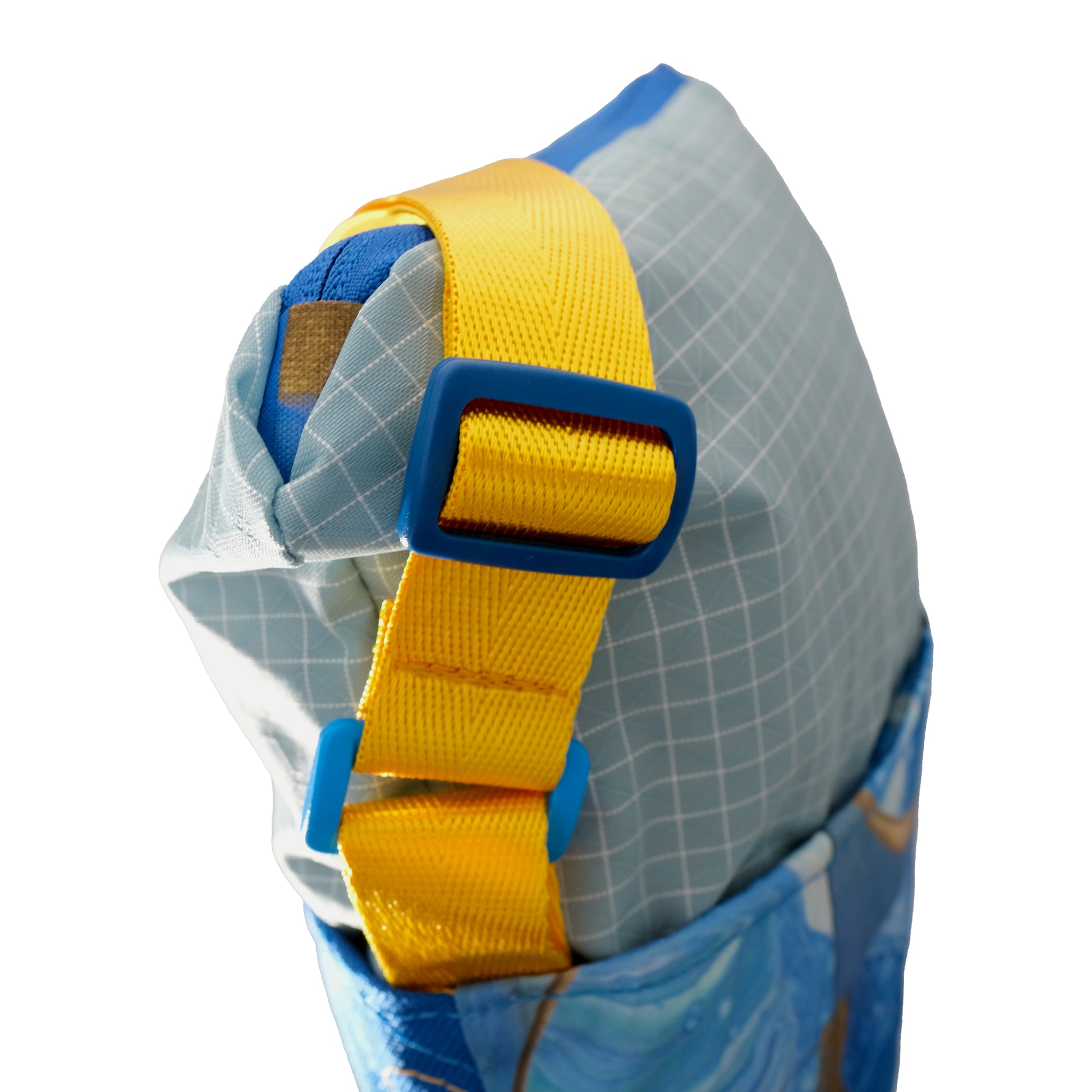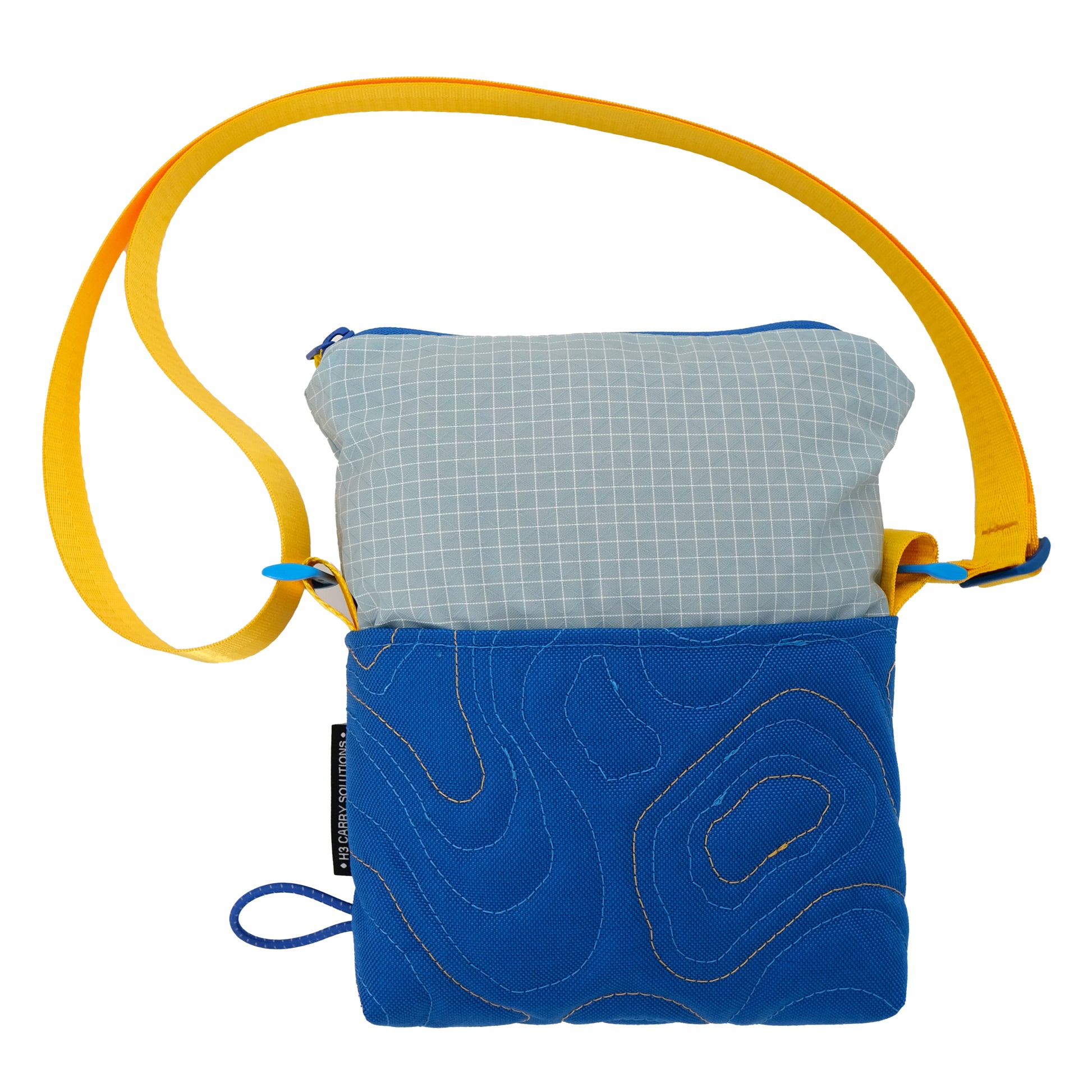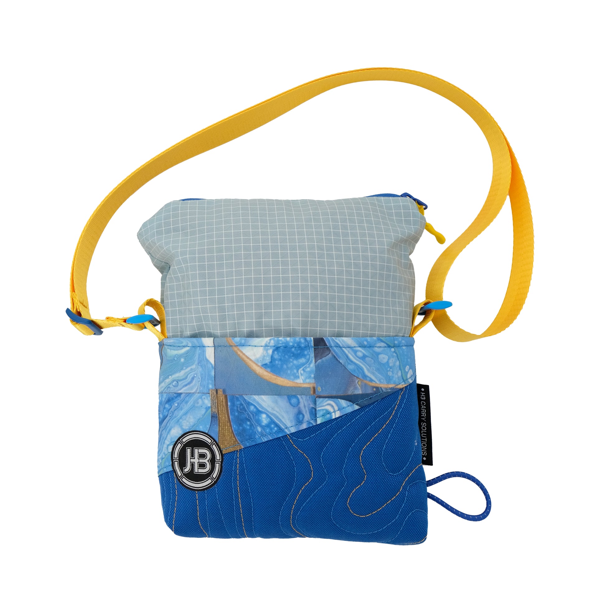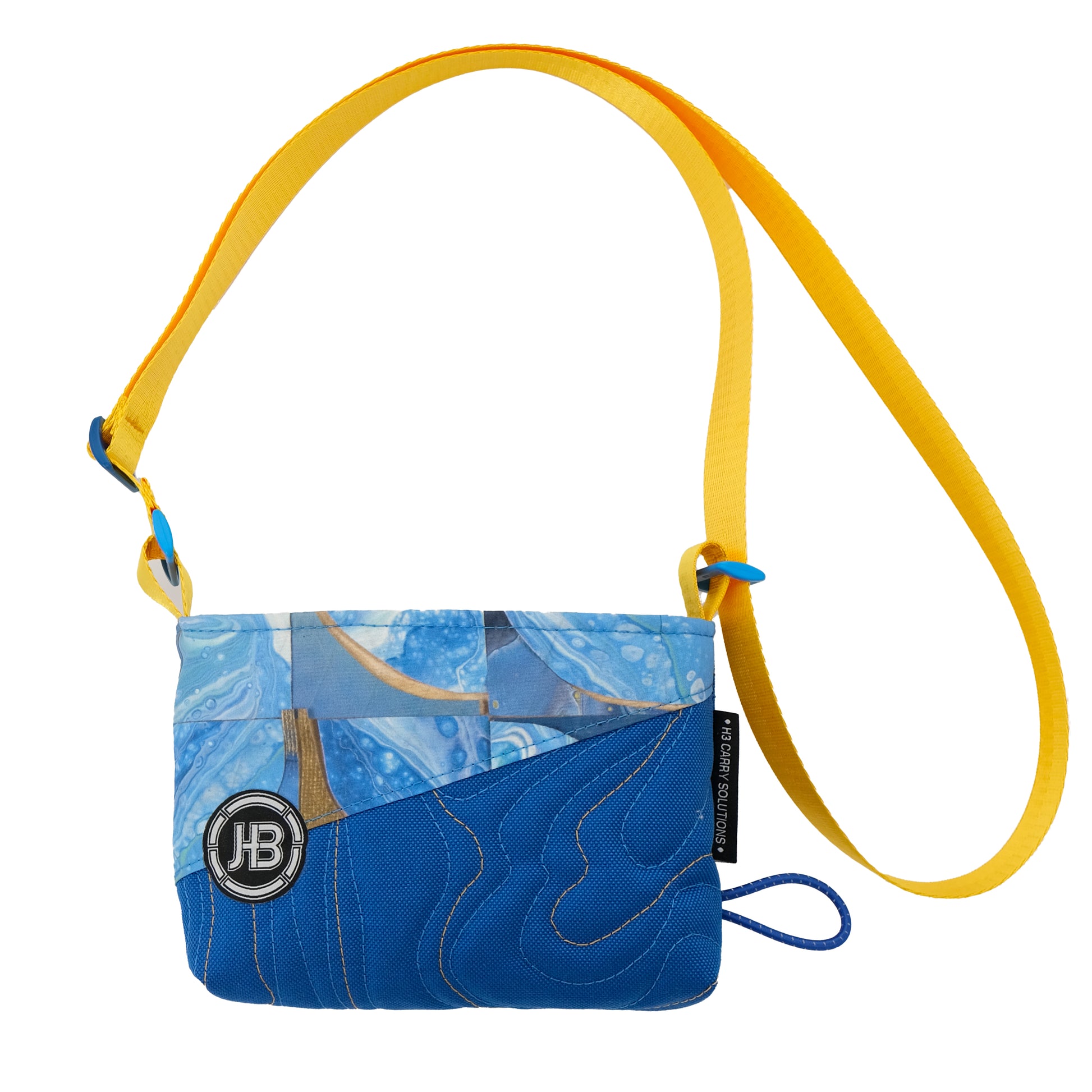 H3's collaboration with Make Pour Choices artist Rahim Gray. Our small carry solution featuring a blue & gold "pour art" mosaic print and blue stitched topo pattern base. The unique topo pattern is stitched in blue and yellow. The upper portion is a light blue grid. The shoulder strap is a complimentary yellow with blue hardware.