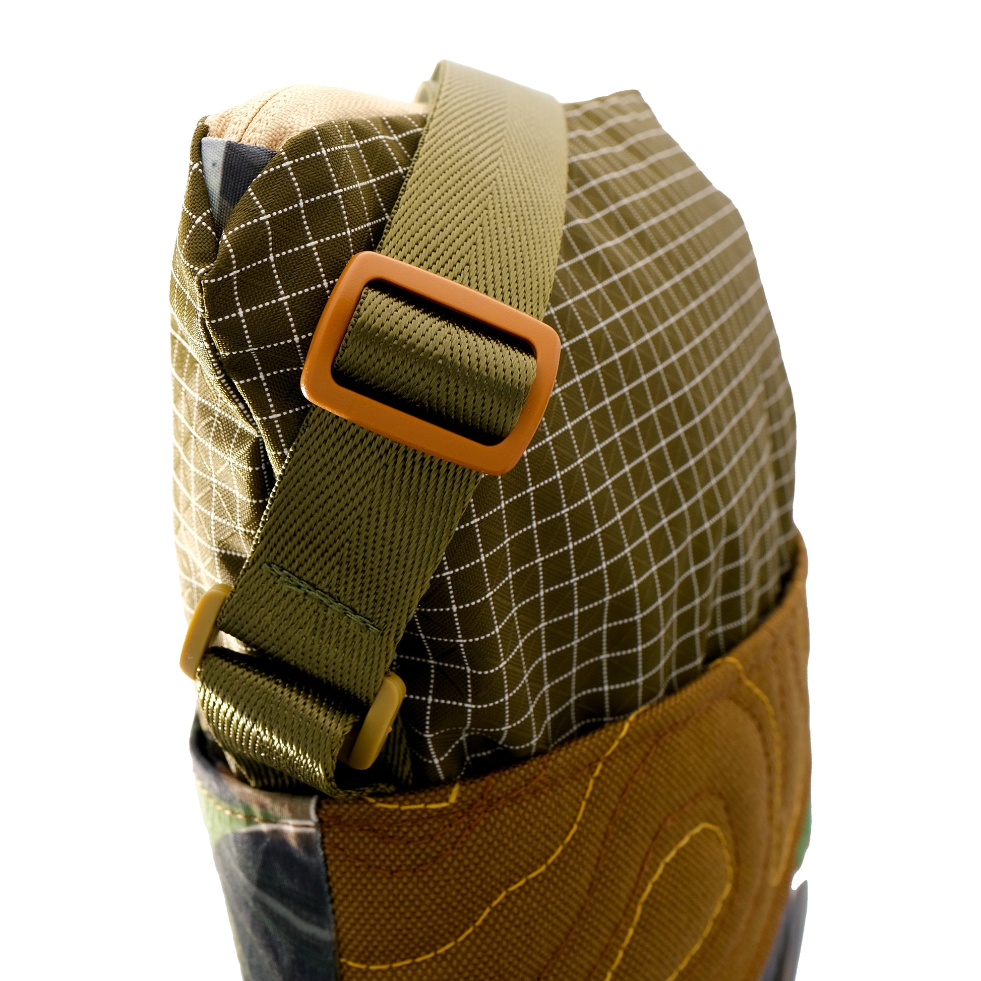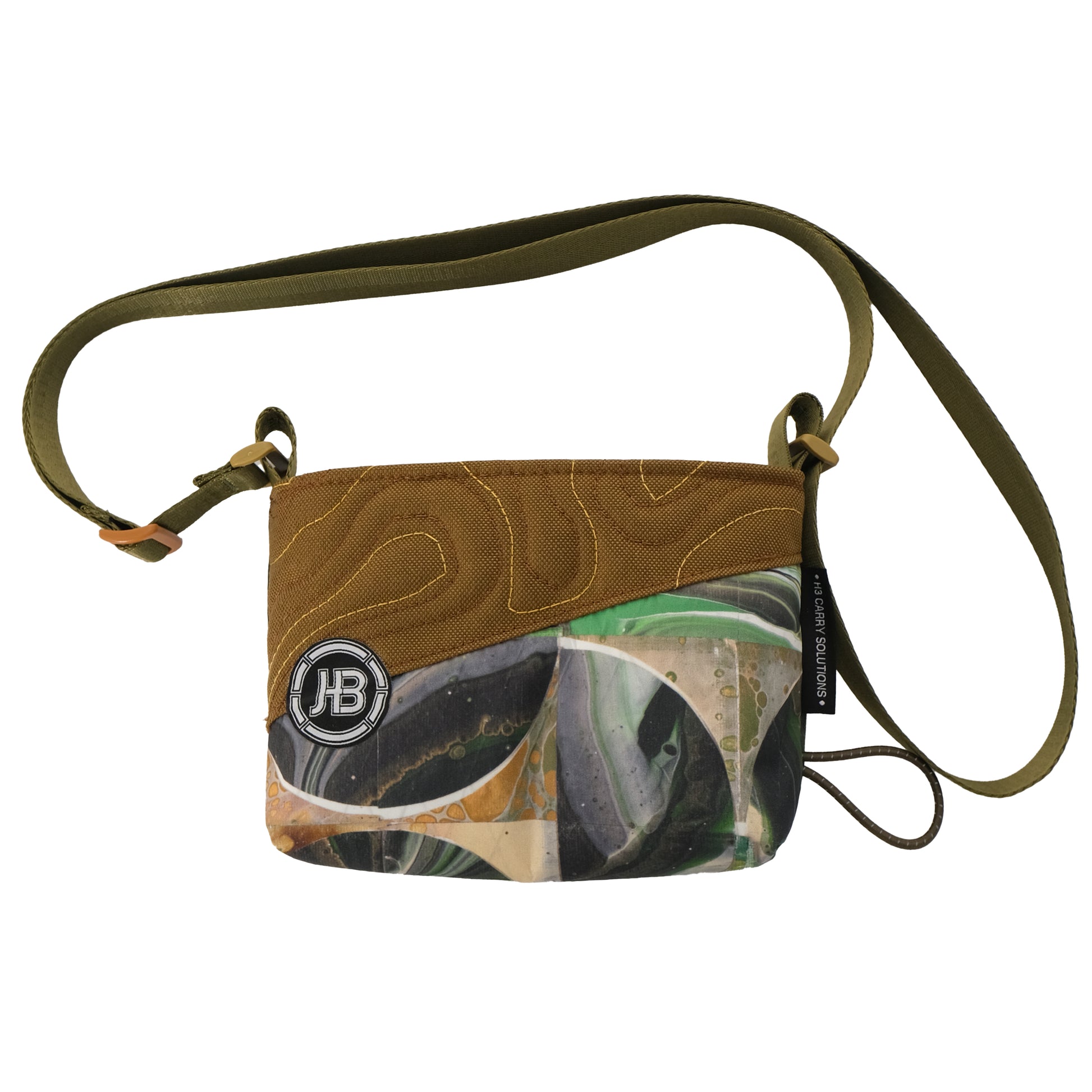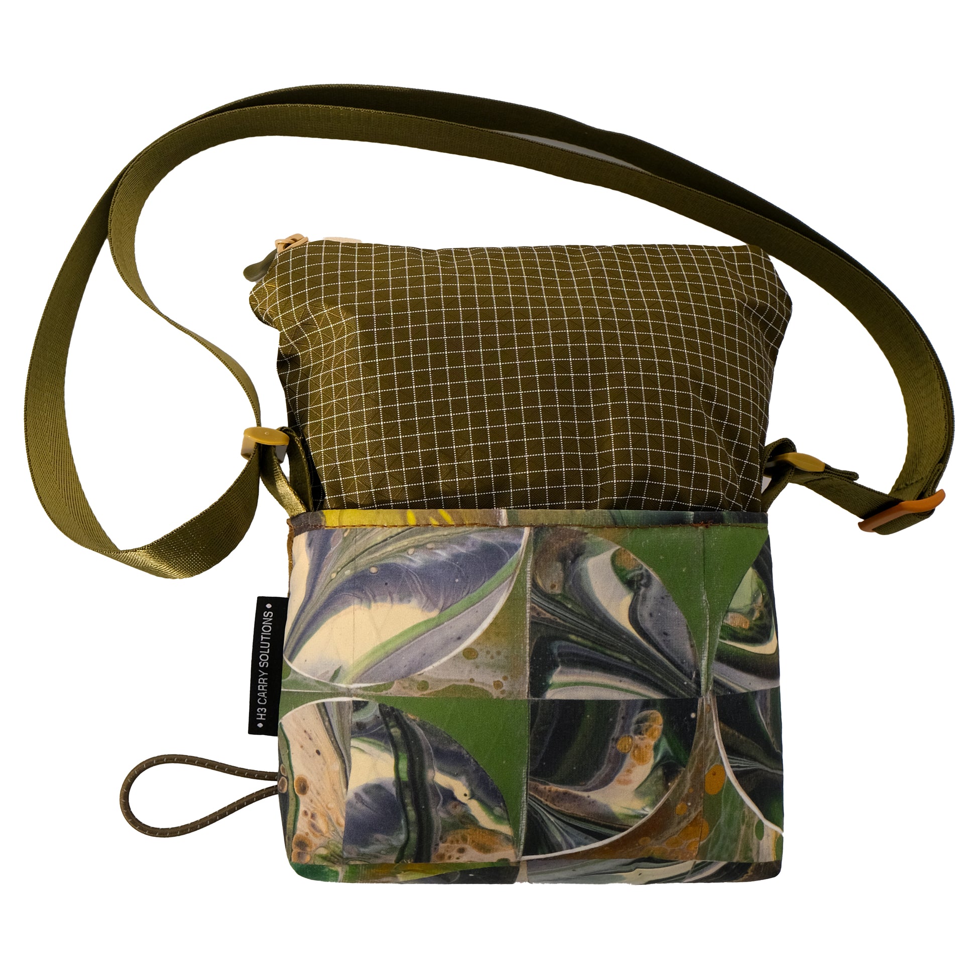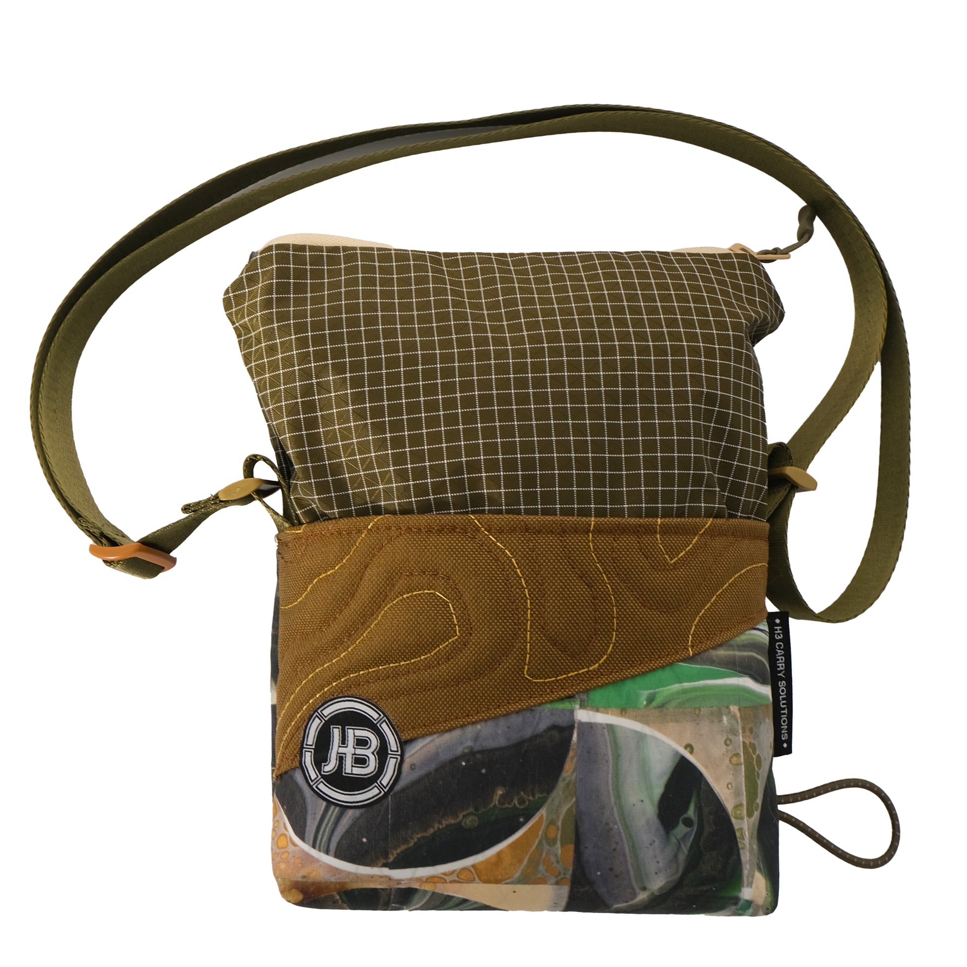 H3's collaboration with Make Pour Choices artist Rahim Gray. Our small carry solution featuring a green, gold, black, & brown "pour art" mosaic print and camel stitched topo pattern base. The unique topo pattern is stitched in brown and yellow. The upper portion is a dark green grid. The shoulder strap is a complimentary green with tan hardware.