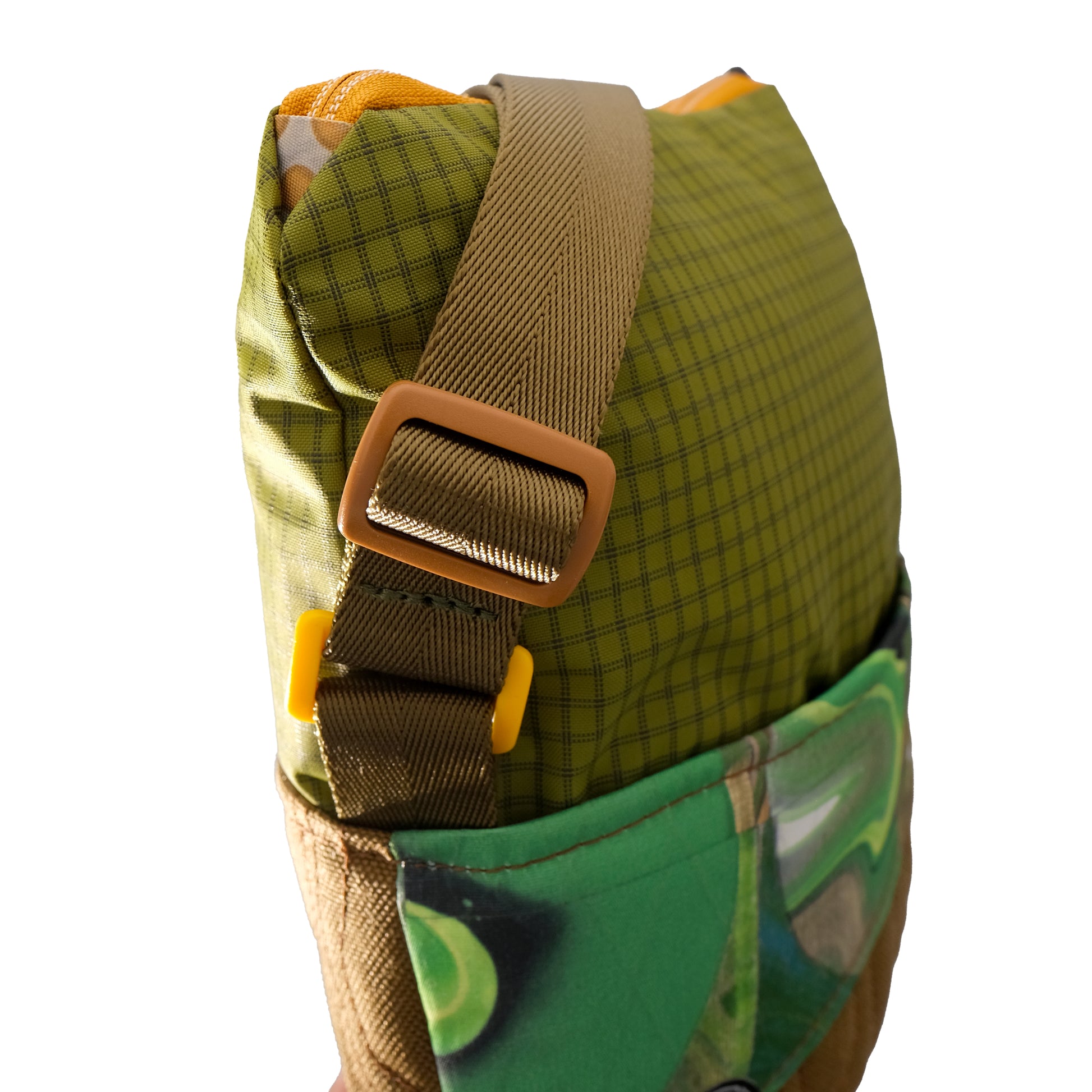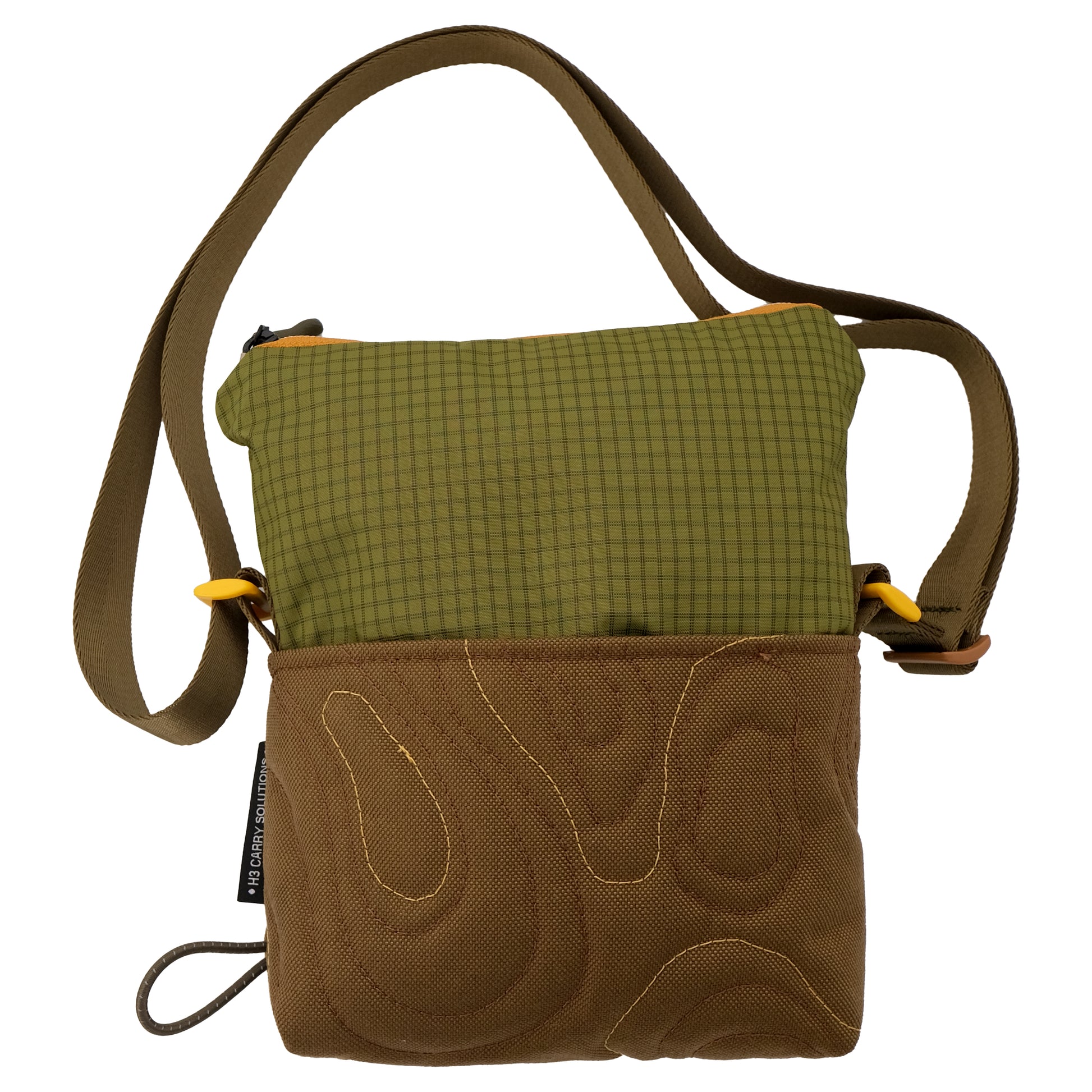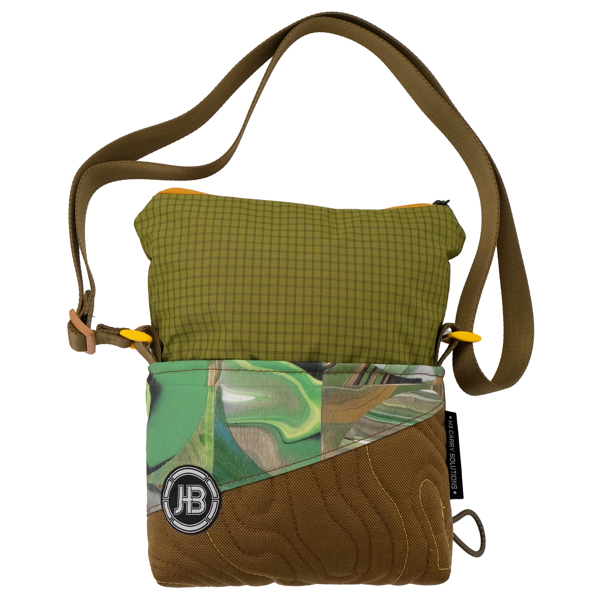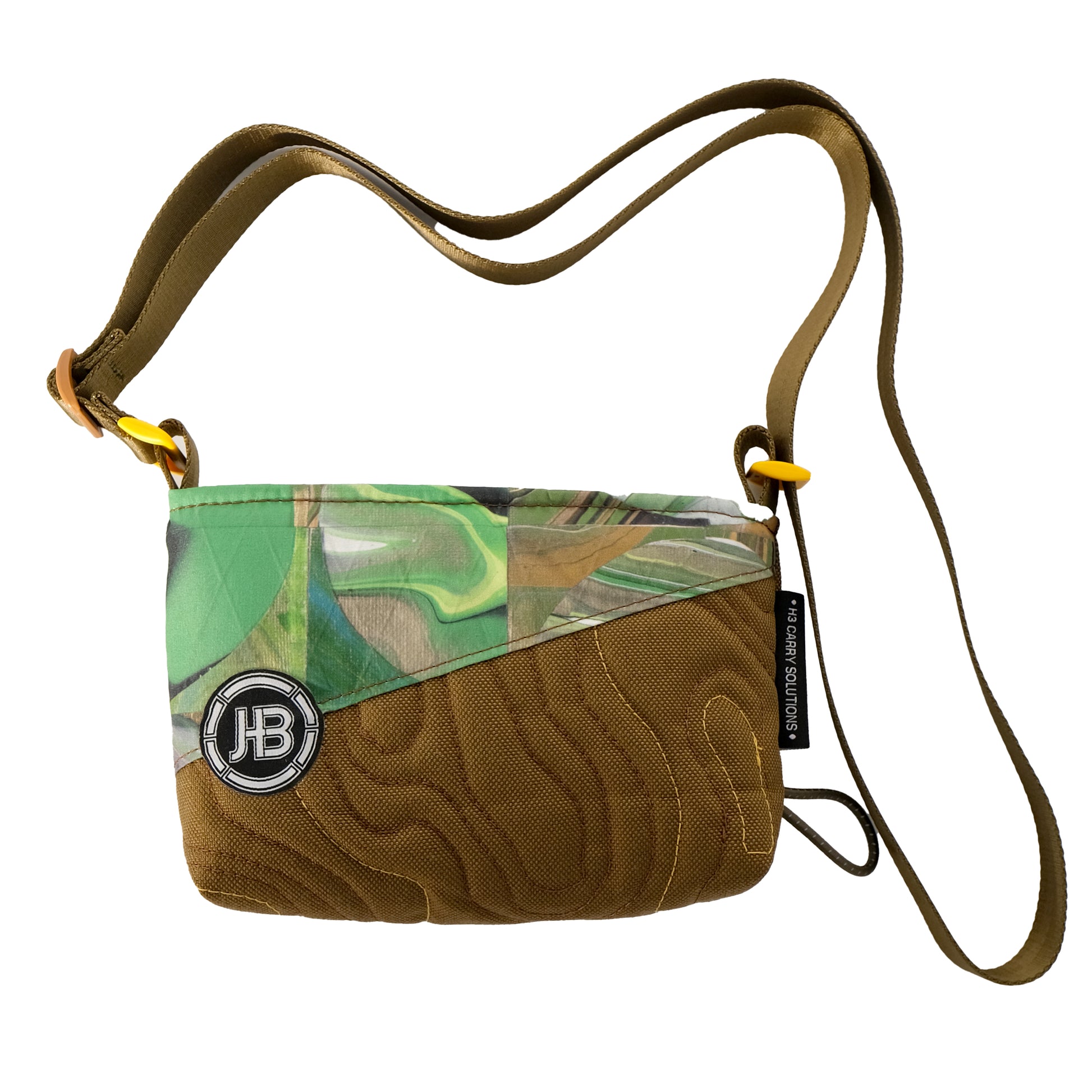 H3's collaboration with Make Pour Choices artist Rahim Gray. Our small carry solution featuring a green, tan, & brown "pour art" mosaic print and camel stitched topo pattern base. The unique topo pattern is stitched in brown and yellow. The upper portion is a green grid. The shoulder strap is a complimentary brown with yellow and tan hardware.