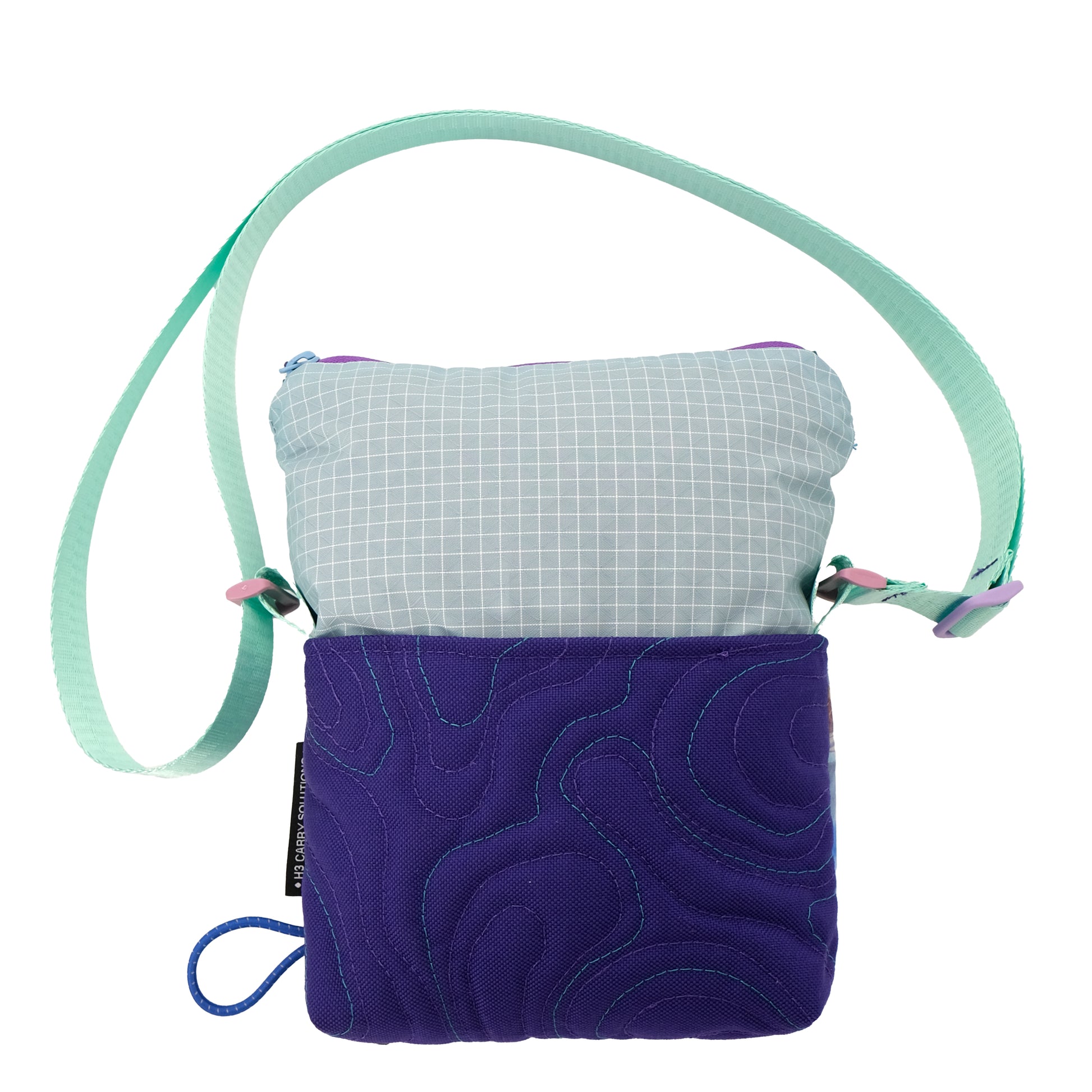 H3's collaboration with Make Pour Choices artist Rahim Gray. Our small carry solution featuring a light blue, gold ,& lavender "pour art" mosaic print and purple stitched topo pattern base. The unique topo pattern is stitched in purple and teal. The upper portion is a light blue grid. The shoulder strap is a complimentary sea-foam blue with lavender hardware.