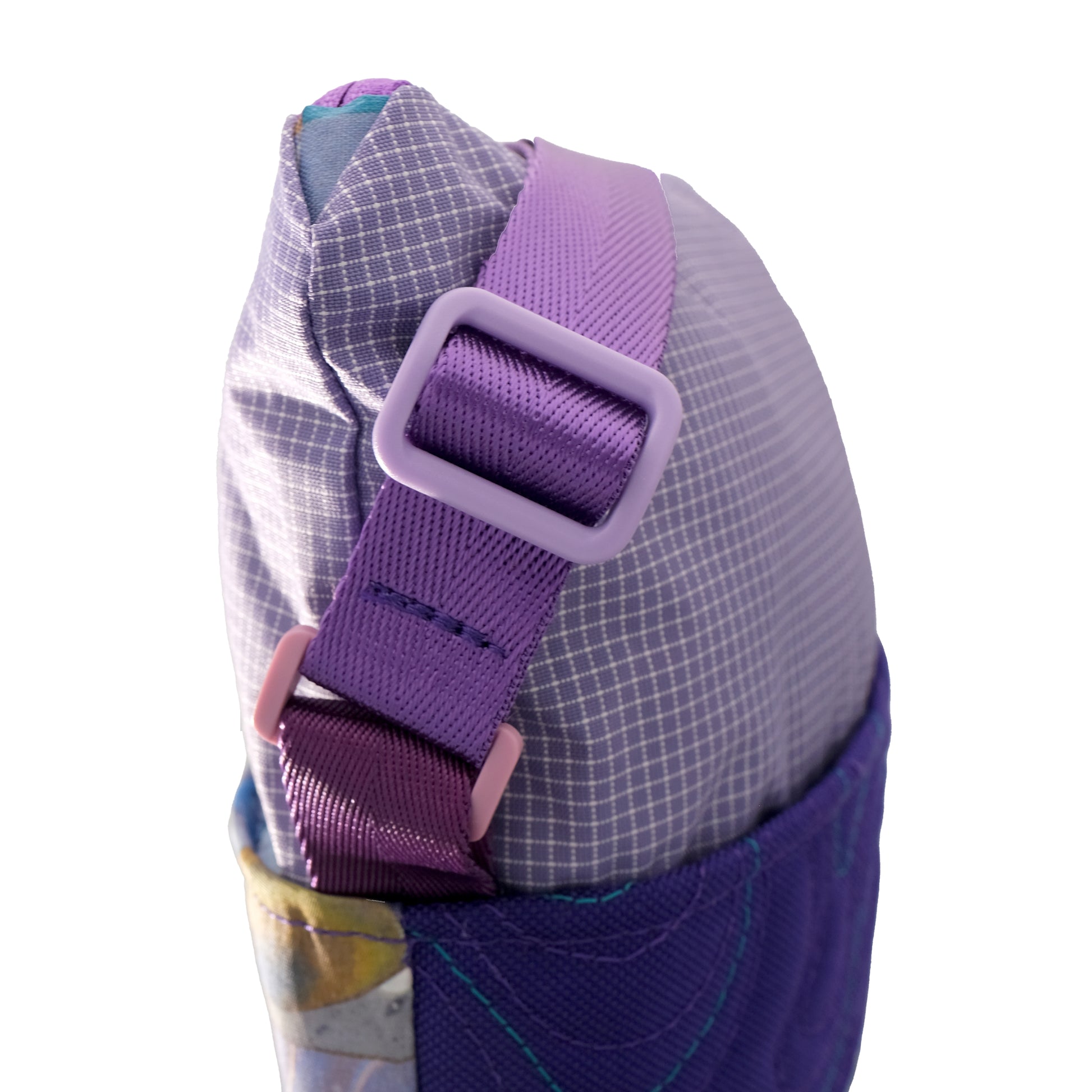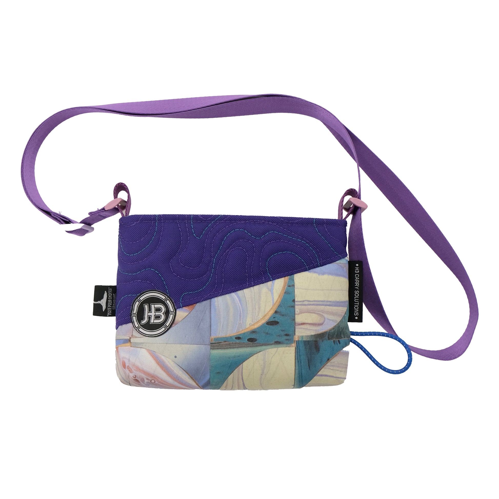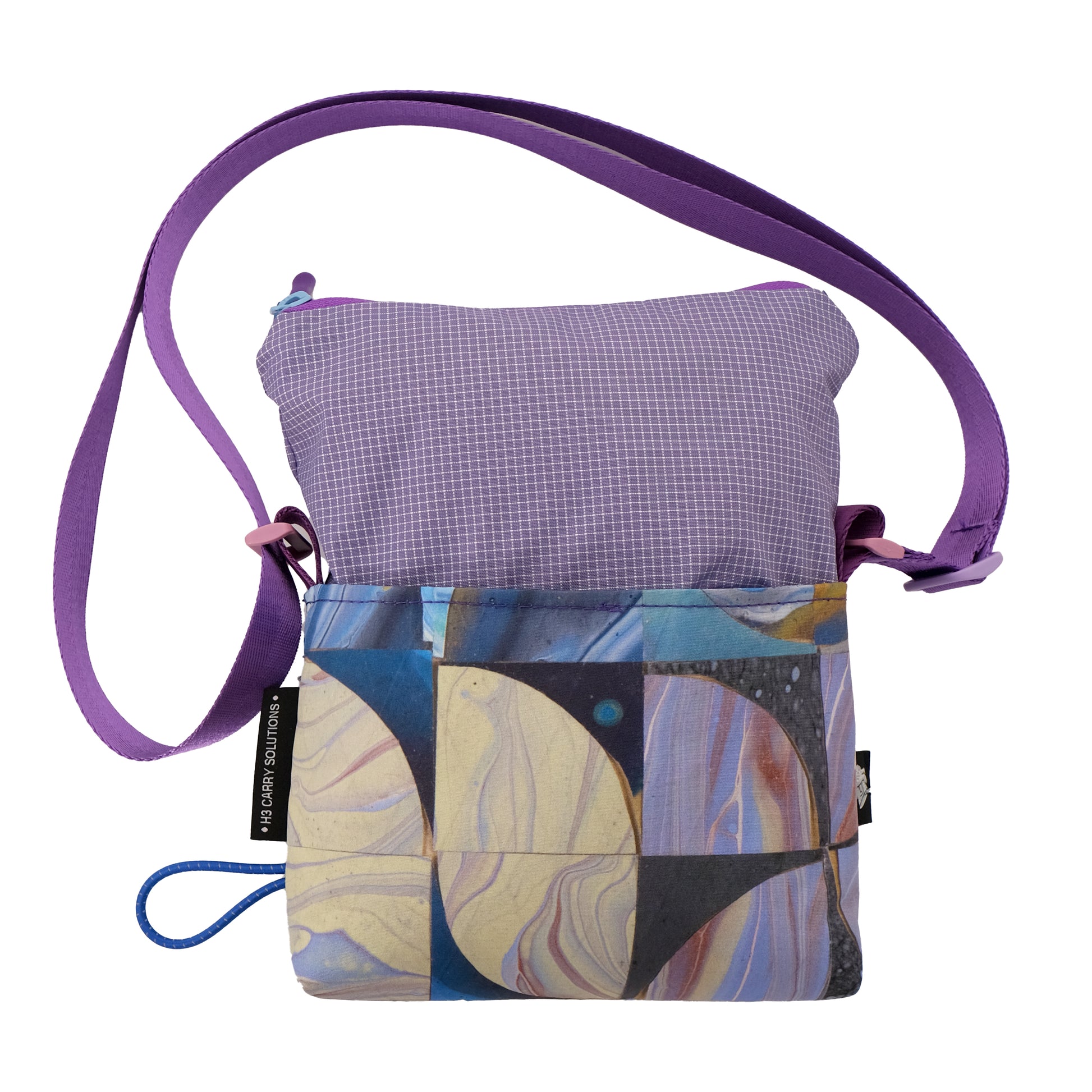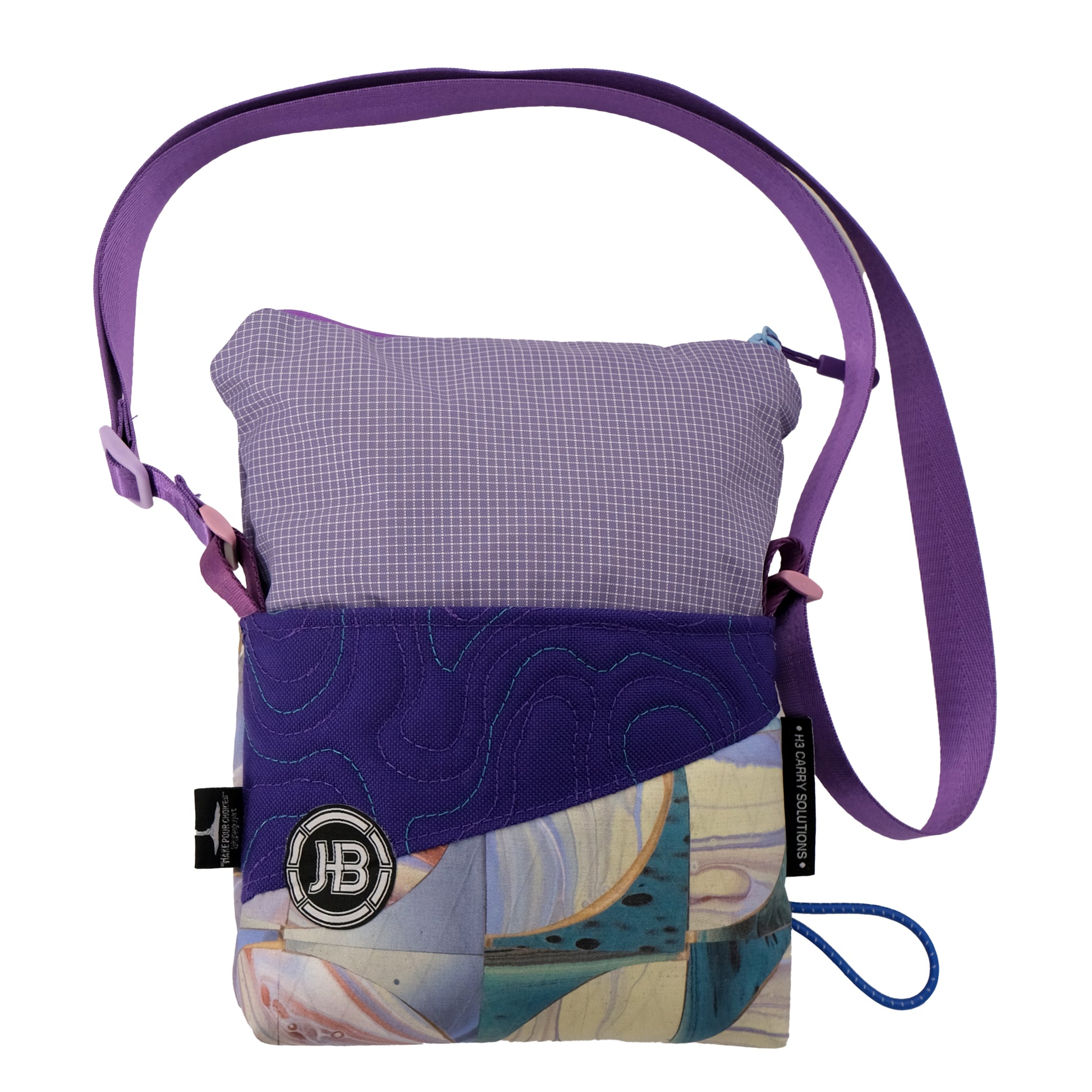 H3's collaboration with Make Pour Choices artist Rahim Gray. Our small carry solution featuring a light blue, teal, cream & lavender "pour art" mosaic print and purple stitched topo pattern base. The unique topo pattern is stitched in purple and teal. The upper portion is a light purple grid. The shoulder strap is a complimentary purple with lavender hardware.