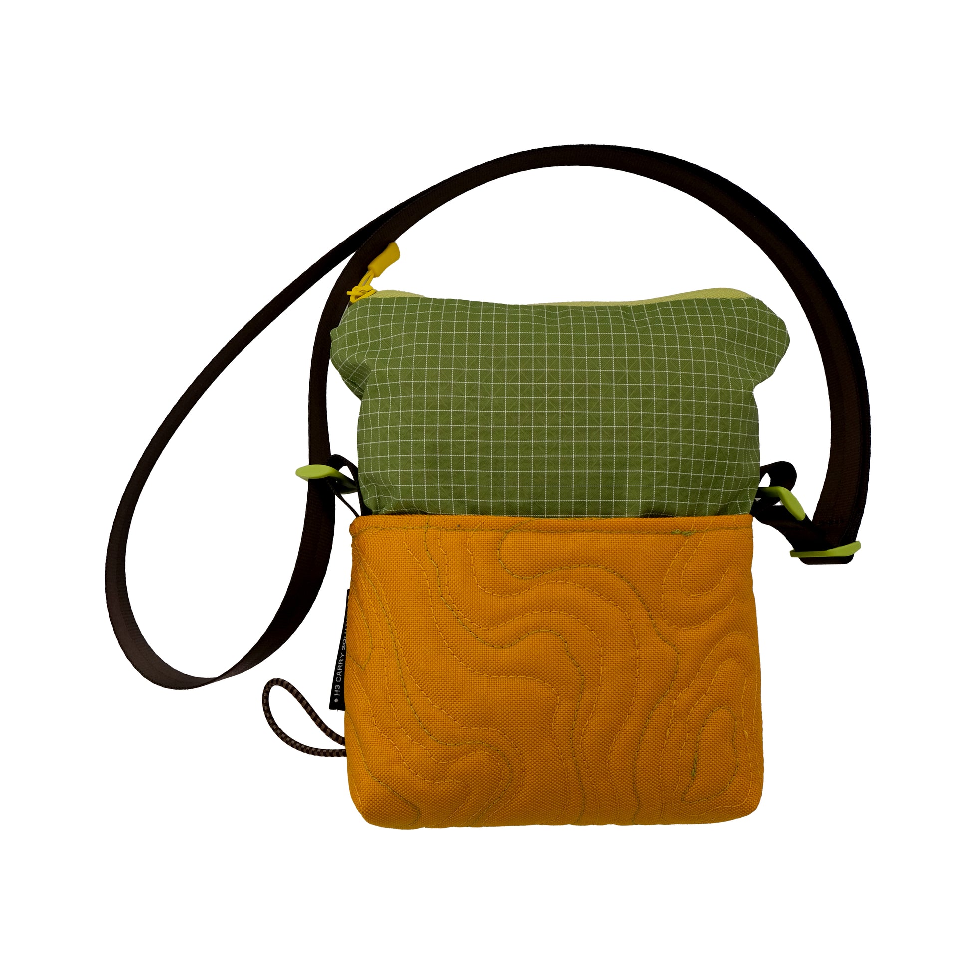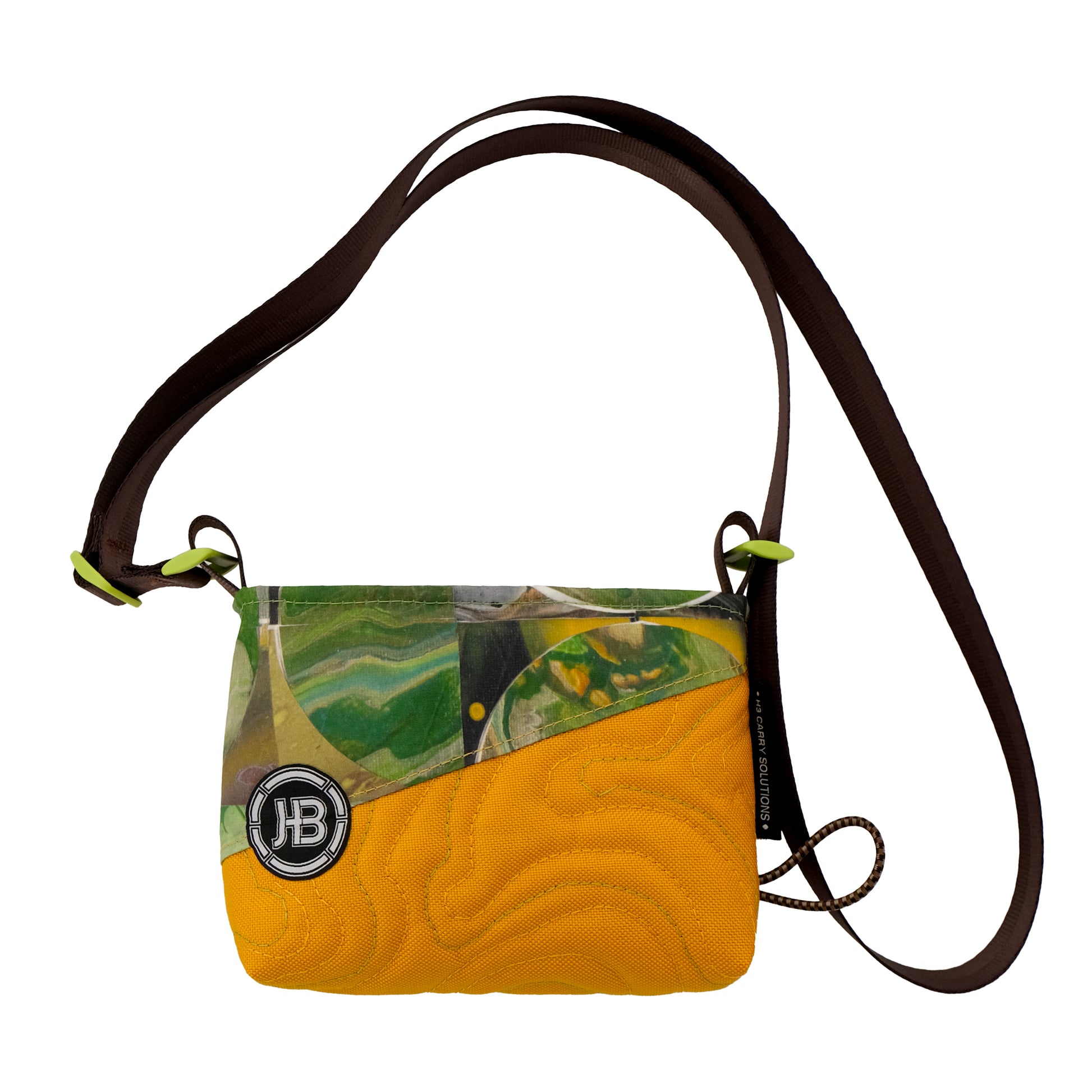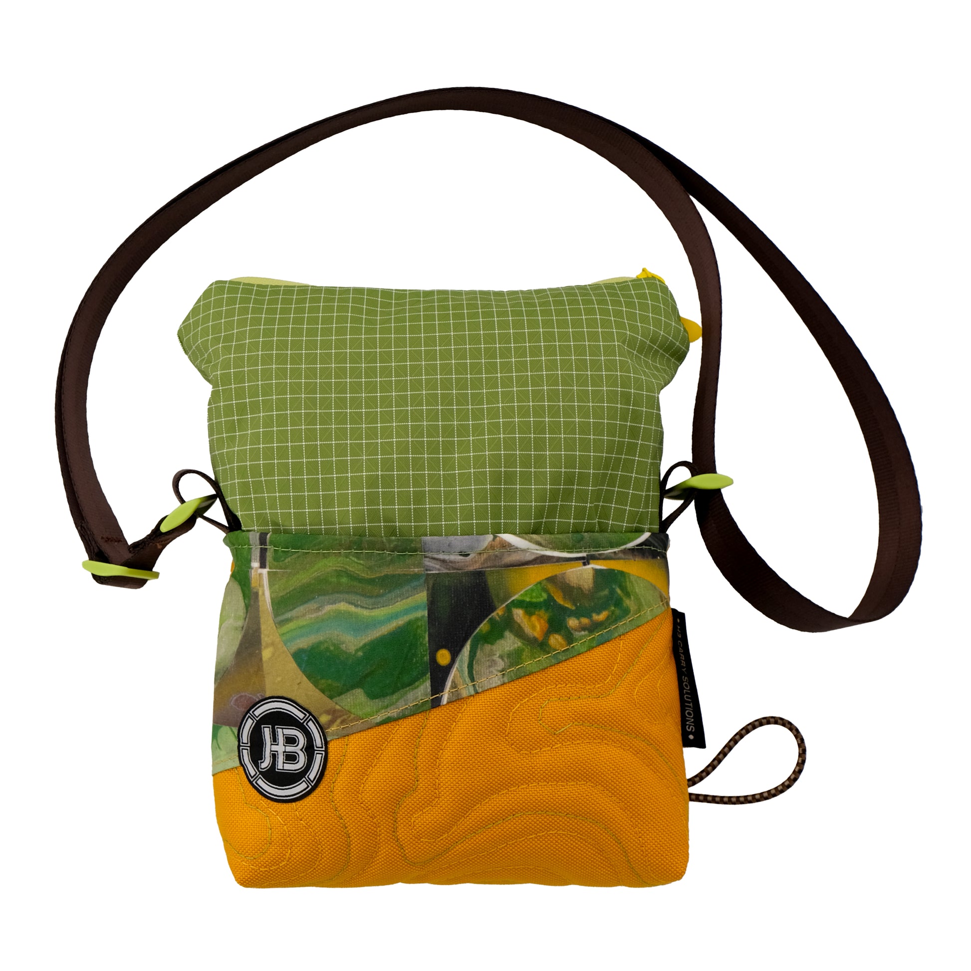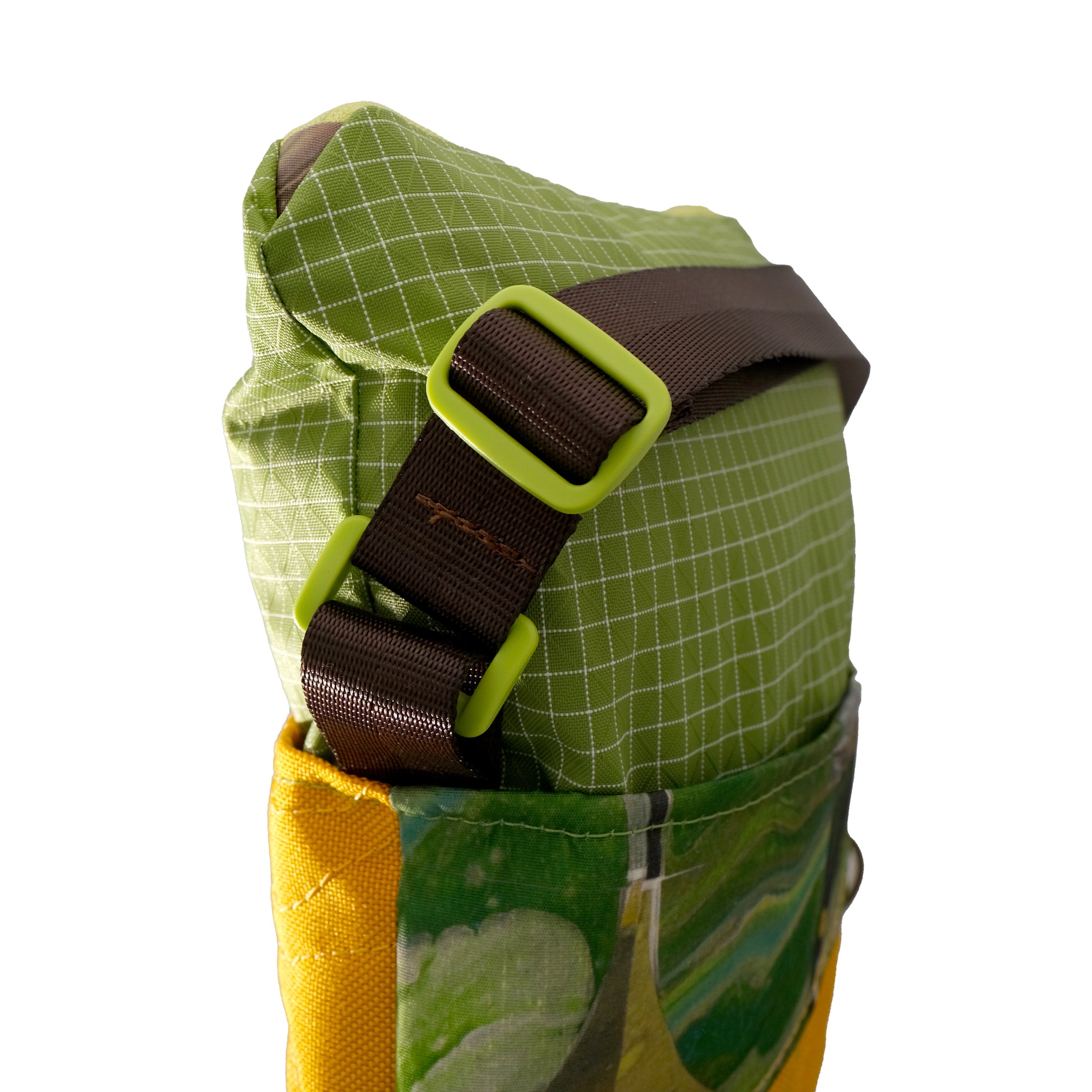 H3's collaboration with Make Pour Choices artist Rahim Gray. Our small carry solution featuring a green, gold, yellow,& tan "pour art" mosaic print and yellow stitched topo pattern base. The unique topo pattern is stitched in yellow and green. The upper portion is a green grid. The shoulder strap is a complimentary brown with lime green hardware.